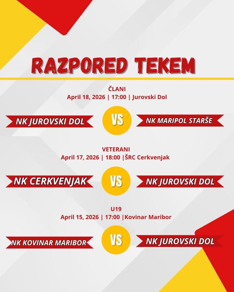 📅 𝗥𝗔𝗭𝗣𝗢𝗥𝗘𝗗 𝗧𝗘𝗞𝗘𝗠 ⚽ Nov teden, nove tekme in novi izzivi za naše ekipe. 💪 Podprimo jih na igrišču — doma in v gosteh! #NkJurovskiDol #mismojurij #rumenordeči #skupajsmomočnejši