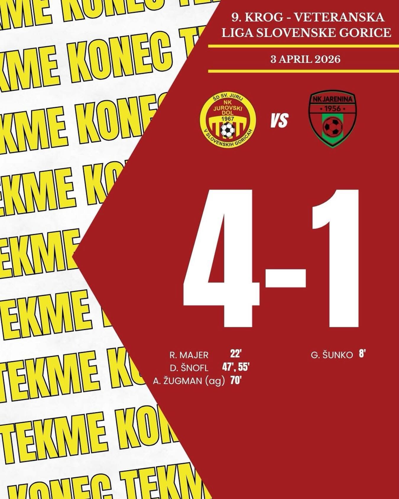 𝗭𝗠𝗔𝗚𝗔 𝗩𝗘𝗧𝗘𝗥𝗔𝗡𝗢𝗩🔴🟡 Naši veterani so na gostovanju pri NK Jarenina prišli do pomembne zmage! 💪 Bravo ekipa! 🔥⚽️ #NkJurovskiDol #NkJarenina #veterani #rumenordeči #mismojurij